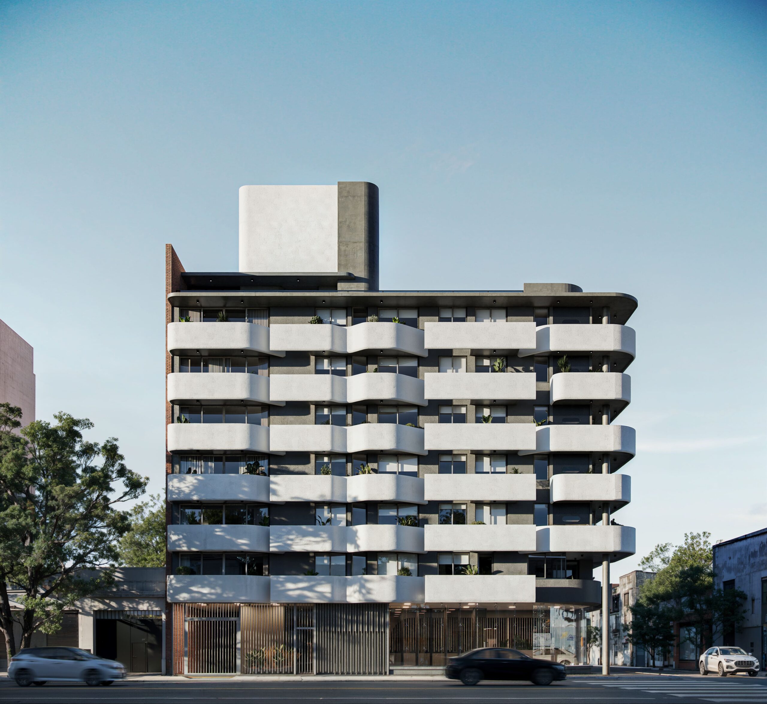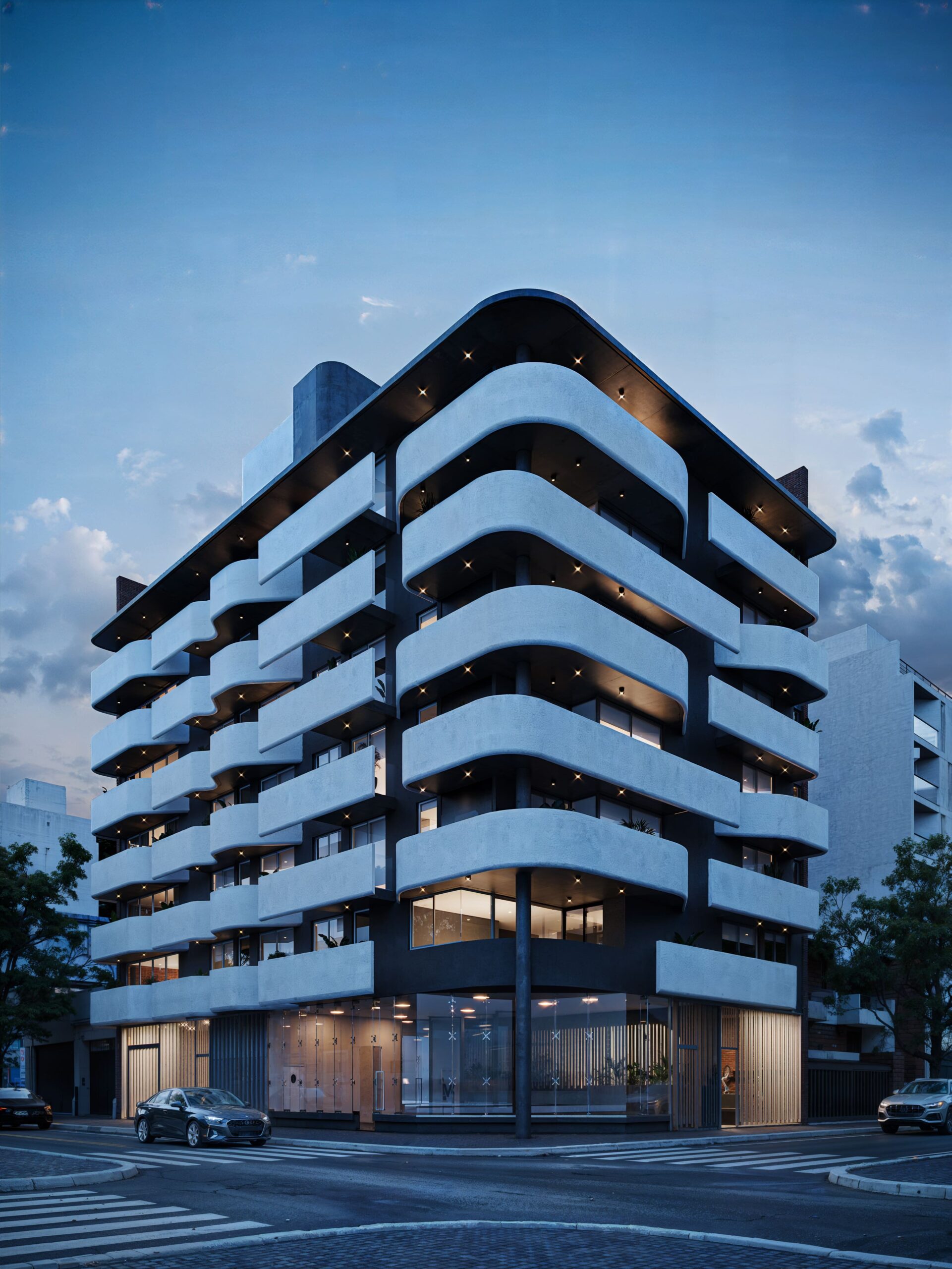 El edificio se caracteriza por un diseño dinámico y fluido, donde las líneas curvas definen su identidad. Esta decisión proyectual no solo aporta carácter al edificio, sino que genera una relación armónica entre interior y exterior. Los amplios balcones acompañan el recorrido de la fachada y permiten una óptima entrada de luz natural, potenciando la luminosidad y la amplitud de los ambientes.