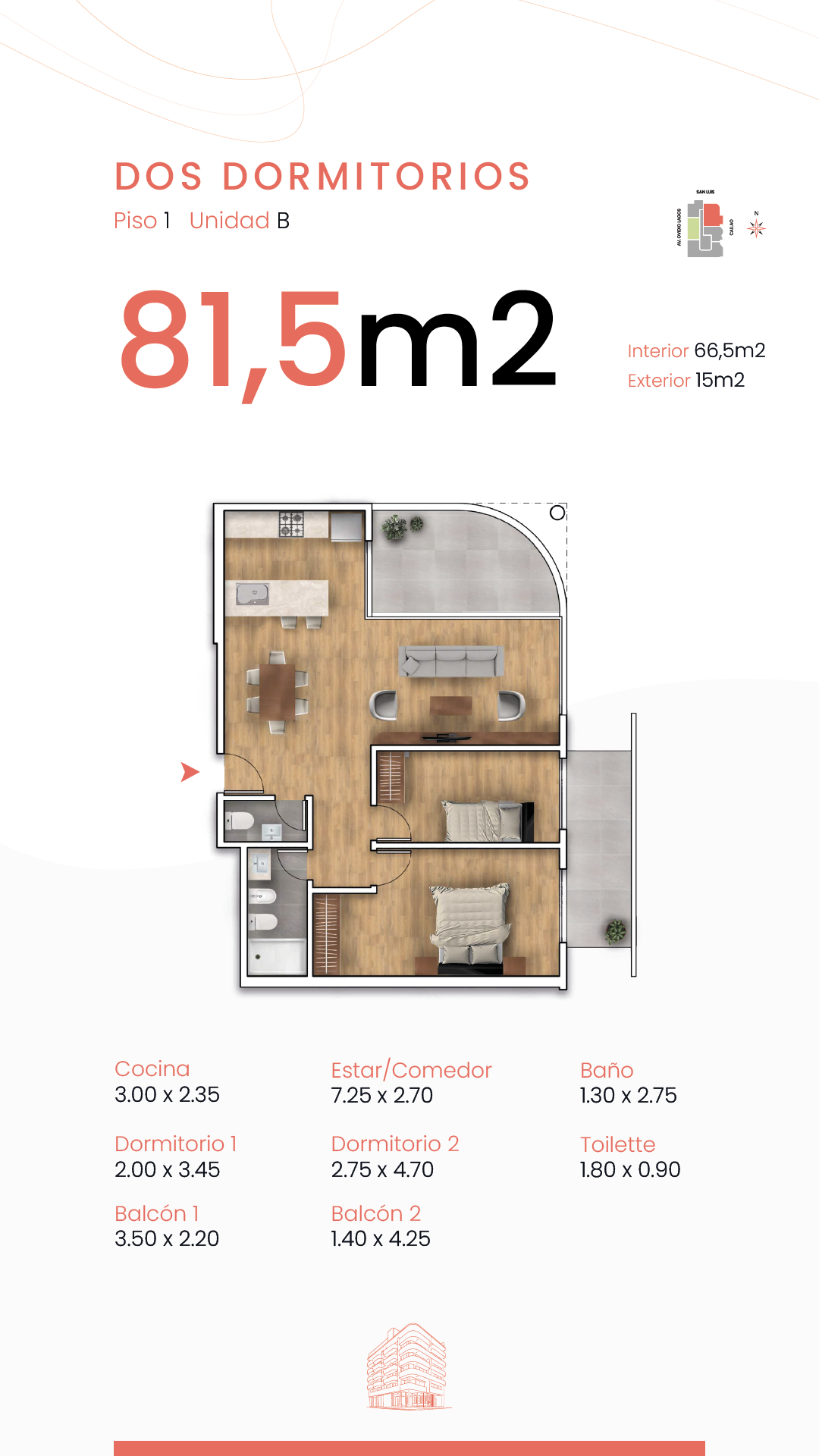 Deneb ofrece unidades de 1 y 2 dormitorios, amplias y funcionales, con distribuciones eficientes y grandes balcones que integran los espacios interiores con el exterior. Cada departamento fue diseñado priorizando el confort, la calidad constructiva y el aprovechamiento de la luz natural.